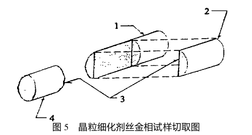 絲:從一卷任意部取一段要求重量的晶粒細(xì)化劑;金相檢驗試樣的縱、橫截面如圖5所示;機械性能測量試樣長度應(yīng)保證300mm。